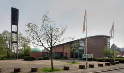 The church displays modern architectural elements that reflect post-war Germany, incorporating both traditional religious features and contemporary design principles of the 1950s.