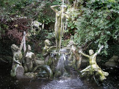 Different sculptures are placed throughout the grounds, including works titled Ringer, Tänzerinnen, and Pan, next to a Moorish-style house.