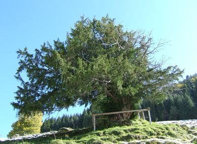 The female European yew features a hollow trunk measuring 5 meters in circumference and extends numerous branches forming a wide spreading crown.