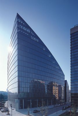 Fritz Novotny designed this structure, which was completed in 2008 by construction company Bilfinger with facade work by Josef Gartner GmbH.