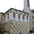 The Gutleutkirche features a 26-meter-high bell tower rising above surrounding roofs and incorporates 28 small square stained glass windows arranged in five rows.