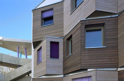 Each residential unit incorporates specialized thinker-bays that function as study alcoves, creating distinct architectural features across the pre-fabricated façades.