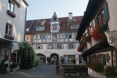 The two-story Renaissance structure features exposed timber framing on its upper level and stands at number 4 Schwörhausgasse in central Ulm.