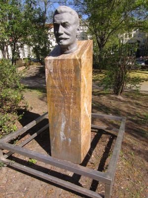 The memorial bust, crafted from artificial stone and marble, stands along Legiendamm street, depicting German labor leader Carl Legien with precise details.