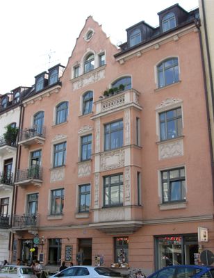 Ickstattstraße 2/2a, symmetrische Gruppe in deutscher Renaissance, mit Erkern, Balkongittern und reichem Stuckdekor, um 1898 von Rosa Barbist