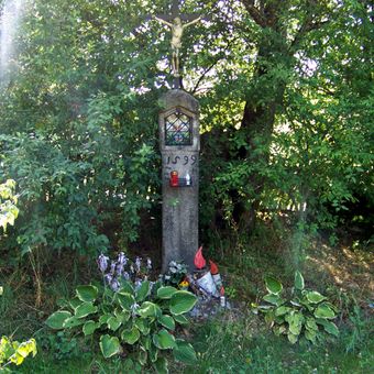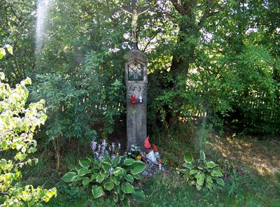 Bildstock, schluttenhof; Granitpfeiler mit Schmiedeeisenkreuz, bezeichnet mit 1599