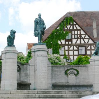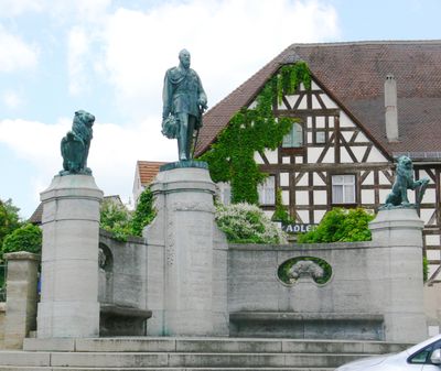 Prinzregentendenkmal, auf Treppensockel halbrunde Bank mit der gesockelten Bronzefigur, von Alois Mayer (Guss H. Klement, München), 1911