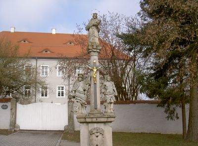 Figurengruppe Waldau, mit den Heiligen Johannes von Nepomuk, Florian und Sebastian, wohl Mitte 18. Jahrhundert, Granitsockel mit Säule