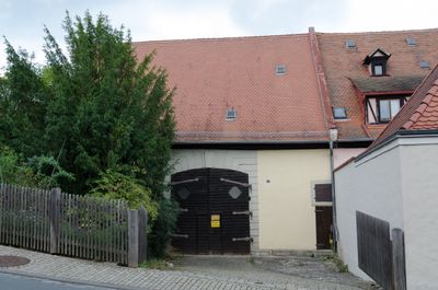 Elisabethenstraße 2b, traufständige, gemauerte Scheune mit Satteldach, Backstein verputzt über profiliertem Sandsteinsockel, zwei stichbogige Einfahrten, um 1743, vielleicht von Johann Jakob Michael Küchel, am unteren Gebäudeteil Überformung durch Schleppgaube von 19