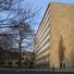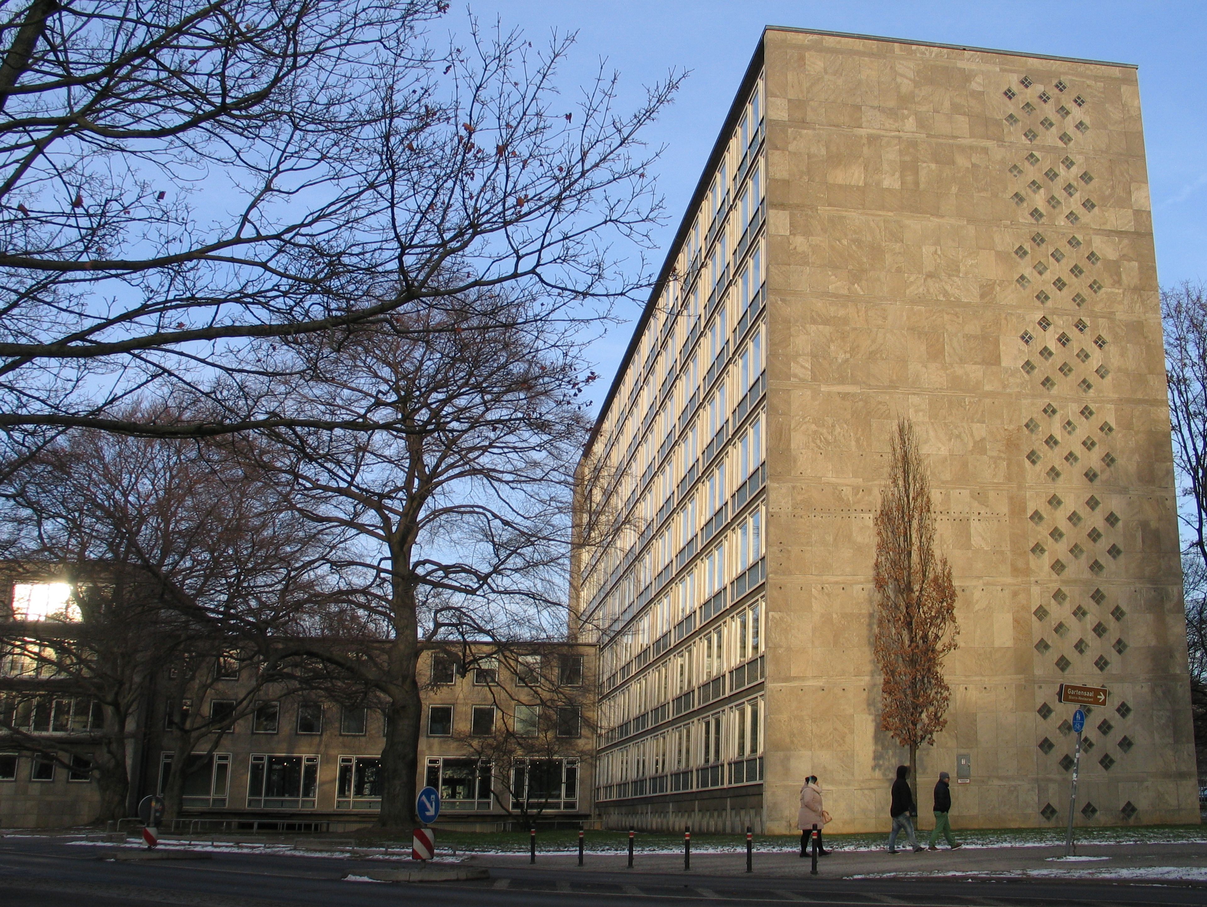 The eight-story administrative building features a natural stone facade and a central entrance hall with a prominent staircase on Rudolf-Hillebrecht-Platz.