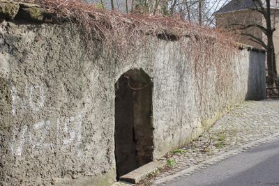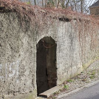 Bruchsteineinfriedung Mühlgäßchen, Reste einer Bruchsteineinfriedung mit niedrigem, rundbogigem Portal; baugeschichtlich von Bedeutung