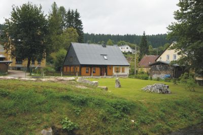 Schleifstein einer ehemaligen Papiermühle Blechhammer (Eibenstock), am Waldrand, Abzweig Kleiner Wilzschweg von Carlsfelder Hauptstraße