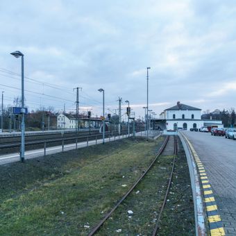 Edificio de servicio de la estación Wurzen, Bahnhof mit Empfangsgebäude, Hausbahnsteig (Bahnsteig 1) mit gußeisernen Säulen und Bahnsteigüberdachung, einstielige Bahnsteigüberdachung (Bahnsteig 2 und 3) mit Holzdach und Holzsäulen, gusseiserne Säulen mit Kompositkapitell am Gleis 6, vor