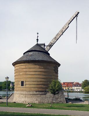The Krananlage is a mechanical lifting device built from metal and timber that once hoisted cargo between riverboats and the dock along the Main. The structure uses counterweights and manual or powered mechanisms to raise and lower goods of varying sizes.