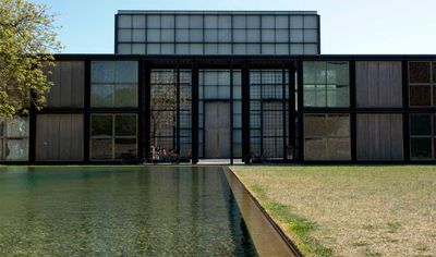 The Christus-Pavillon is a modern church building in Körner featuring glass and steel construction with a central cubic sacred space at its core. A rectangular cloister walkway wraps around this inner sanctum, forming the building's outer structure.