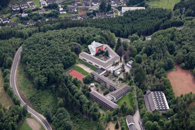 The educational complex includes modern buildings with a crucifix-topped tower situated on an elevated position near Landstrasse 715 in Altenhundem.