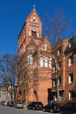 The Rosary Basilica stands with its brick exterior and Romanesque Revival style at Kieler Straße 11 in the Steglitz district of Berlin.