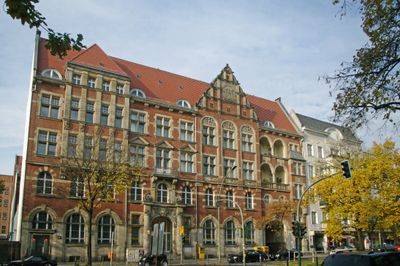 The Renaissance Revival structure features a brick facade with decorative sandstone elements and classical proportions along Hauptstraße in Berlin.