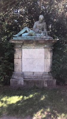 The Kolonialkriegerdenkmal features a soldier in tropical uniform sitting with a rifle on his lap upon a neoclassical sandstone pedestal with pilasters.