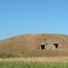 The megalithic tomb features two parallel entrance passages leading to a central chamber divided by large stones beneath an earthen mound.