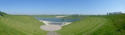 The theatre contains an 800-square-meter circular stage within a natural amphitheater setting, providing seating for 3,000 spectators in the Hedeland landscape.