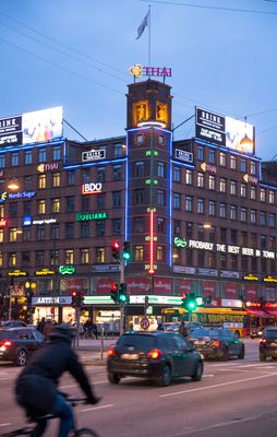 The building displays one of Copenhagen's rare preserved neon advertisements from the 1930s, featuring a thermometer in neon tubes running up the tower.