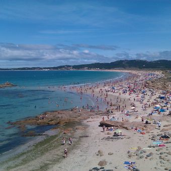 A Lanzada is a white sand beach stretching 2400 meters between the municipalities of Sanxenxo and O Grove along the Galician Atlantic coast. The shore offers a wide sandy expanse reaching up to 70 meters and is backed by a natural dune landscape that separates it from the hinterland.
