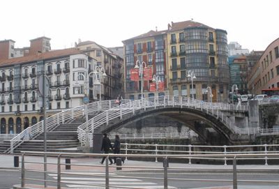 The Puente de la Ribera spans across the Nervión River with a steel and concrete structure that connects both sides of central Bilbao.