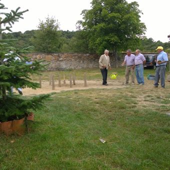 Players roll a semi-spherical wooden ball weighing between 800 and 1000 grams down a 30-meter lane to knock down nine large pins and one smaller pin.