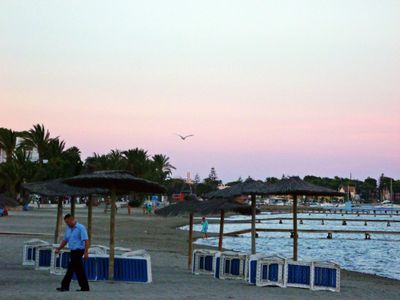 The beach extends along the Mediterranean coast with fine golden sand and moderate waves suitable for swimming during summer months.
