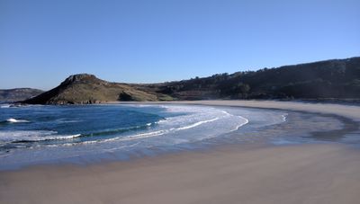 Soesto beach extends for 850 meters along the Galician coast, featuring white sand bordered by mountains and dense forests at its edges.