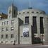 The church displays a cylindrical structure with two concentric circles, where the interior cylinder stands taller than the exterior one, covered in gray granite.