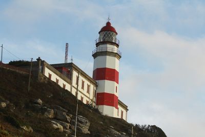 The white lighthouse tower extends 30 meters high from a rectangular building situated 85 meters above the Atlantic Ocean near Punta de A Negra.