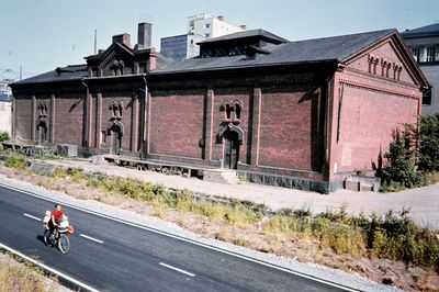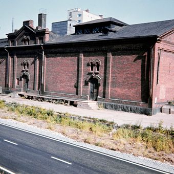 The three-story brick building stands along Hämeentie street, featuring solid walls and minimal windows in its architectural design.