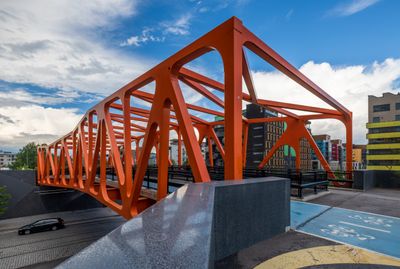 The steel structure spans 44 meters across Välimerenkatu, featuring a bright orange profile and connecting Hyväntoivonpuisto with Selkämerenpuisto parks.