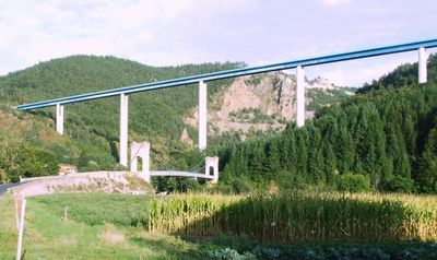 The Viaduc du Lignon stretches 640 meters across the Lignon Valley, featuring a mixed steel and concrete construction that rises 110 meters above the river.