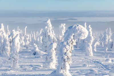 During winter months, moisture from Lake Kitkajärvi creates thick frost formations on the spruce trees, transforming the landscape into white-covered forest structures.