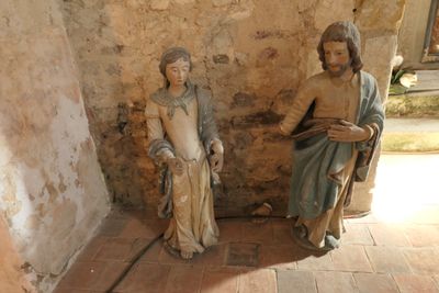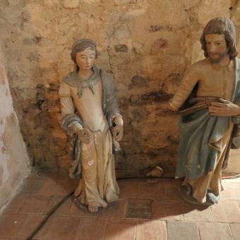 The Virgin, the Child Jesus and Saint Joseph, 17th century sculpted group in polychrome terracotta located in the Notre-Dame chapel in Pritz near Laval (Mayenne, Pays de la Loire, France); classified as a Historical Monument Object (PM53000349) ; Child Jesus gone