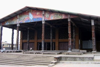 The Saint Michel de Nkembo church features 35 wooden pillars made from Kevazingo wood, displaying carved biblical scenes along the central nave.