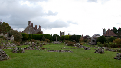 Shaftesbury Abbey is a former Benedictine nunnery whose foundation stones and walls lie scattered across a spacious garden in North Dorset. The visible remains show medieval building techniques, including sections of arches and thick stonework.