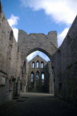The stone walls and arched windows of Grey Abbey extend across its church, cloister, and surrounding buildings within a parkland setting near Strangford Lough.