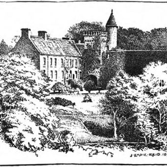 Airlie Castle is a fortified stone structure in Angus, Scotland, positioned where two rivers meet. The complex features thick defensive walls, a gatehouse with a round tower, and was originally designed as a residential stronghold for a noble family.