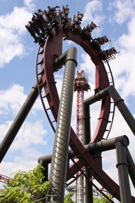 Located in Surrey, Nemesis Inferno extends across 750 meters of twisted steel track with four inversions, including a vertical loop and interlocking corkscrews point.