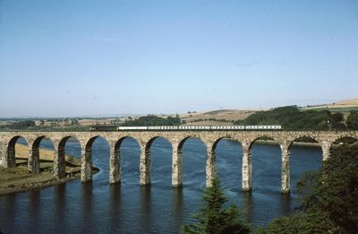 The bridge maintains regular rail service between London and Edinburgh, with modified overhead lines installed in 1989 for electric train operations.