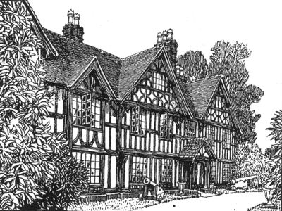 The large country house displays Tudor architectural elements with distinctive features from its original 1651 construction and early 19th-century modifications throughout its structure.