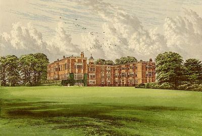 Temple Newsam is a Tudor-period mansion in Leeds arranged around a rectangular courtyard and surrounded by gardens and farmland. The building shows a mix of red brick and stone walls, with several wings reflecting different construction phases.