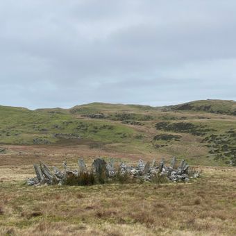 Bryn Cader Faner is a round stone cairn from the Bronze Age located on a mountain ridge in Gwynedd, Wales. The site consists of a circular mound surrounded by roughly 20 thin stone pillars that project outward, creating a distinctive appearance from the surrounding landscape.