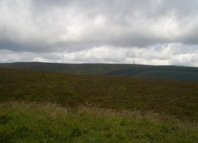 Bache Hill rises to an elevation of 610 meters in the Central Wales region, featuring grassland slopes and a prominent trig point at its peak.