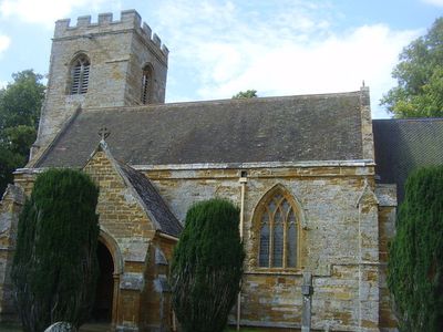 The church stands isolated next to fields and a pond following the relocation of the entire village by Sir Christopher Hatton in the 1570s.