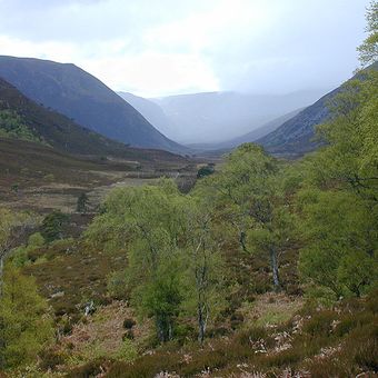 Alladale Wilderness Reserve is a large protected area in the Highlands featuring mountains, forests, rivers, and lochs across its terrain. The landscape supports native Scottish plants and animals in a mix of different habitats.